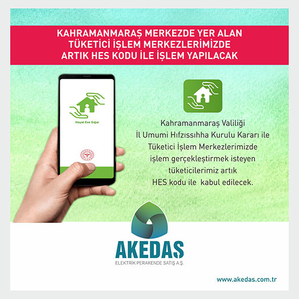 Sağlık Bakanlığı tarafından uygulamaya konulan ve birçok alanda zorunlu hale getirilen HES (Hayat Eve Sığar) kodu, Kahramanmaraş Valiliği İl Umumi Hıfzıssıhha Kurulu Kararı ile Akedaş Tüketici İşlem Merkezlerinde de zorunlu hale geldi. İlk olarak Kahramanmaraş Merkezde yer alan Tüketici İşlem Merkezlerinde uygulanmaya başlanan sistemin, ilçelerde ise önümüzdeki günlerde faaliyete geçeceği bildirildi.