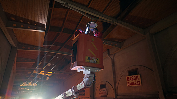 Büyükşehir Belediyesi, Tarihi Kapalı Çarşı’da zamanla eskiyen, yetersiz kalan ve enerji verimliliği düşük olan aydınlatmaları tarihi dokuya uygun modern ve estetik aydınlatma elemanlarıyla değiştiriyor.