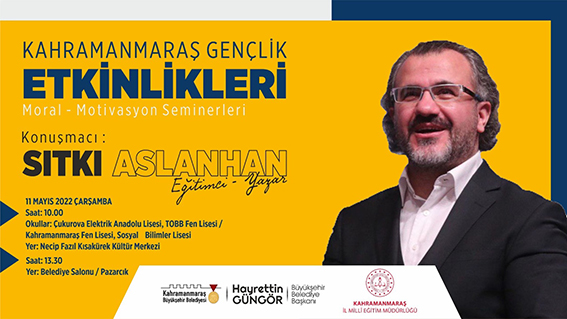 Büyükşehir Belediyesi ve İl Milli Eğitim Müdürlüğü iş birliğiyle düzenlenen eğitim programlarında öğrencilerle bir araya gelen Yazar Sıtkı Aslanhan, 11 Mayıs Çarşamba günü NFK’da ve Pazarcık Belediyesi Konferans Salonu’nda gerçekleştirilecek seminerlerde sınava hazırlık sürecindeki öğrencilere faydalı bilgiler aktaracak.
