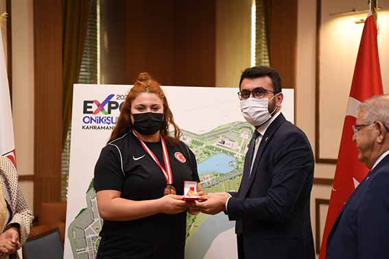 Başkan Mahçiçek maddi olmasa da manevi değeri olacağını belirttiği Onikişubat Belediyesi’nin madalyasını, teşekkür plaketini ve üç tam altını Halter Şampiyonu Melike Günal’a takdim etti. Sporcumuz Melike Günal’a Belediyenin madalyası takılırken altın madalya beklediğini belirten Onikişubat İlçe Başkanı Mücahit Kara, başarılarının devamını diledi ve kızımızı tebrik etti.