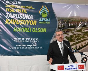 Tapu teslim töreninde konuşan Büyükşehir Belediye Başkanı Hayrettin Güngör, “Neredeyse yarım asırlık süregelen bir sorunun çözümüne şahitlik etmenin mutluluğunu yaşıyoruz. Emeği geçen herkese teşekkür ediyorum. Afşin’de 40 yıllık bu sorunun çözüme kavuşması da son derece kıymetli. Hak sahiplerimizin sorunları bugün itibariyle çözüme kavuşmuş oluyor. Hayırlı uğurlu olsun. Rabbim bu konutlarda huzur içerisinden yaşamayı nasip etsin” ifadelerini kaydetti.