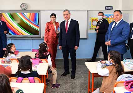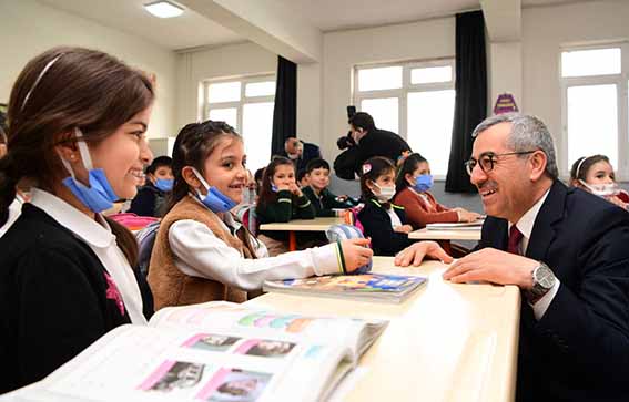 Kahramanmaraş Büyükşehir Belediye Başkanı Hayrettin Güngör, Onikişubat Ahmet Bayazıt İlkokulu’nu ziyaret ederek okul idarecileri, öğretmenler ve öğrencilerle bir araya geldi. İl Milli Eğitim Müdürlüğü ile Tarım ve Orman İl Müdürlüğünün ortaklaşa hayata geçirdiği “Balık Yiyorum, Sağlıklı Büyüyorum” projesi kapsamında gerçekleştirilen programda Başkan Güngör’ün yanı sıra Vali Ömer Faruk Coşkun, Onikişubat Kaymakamı Serkan Keçeli, İl Milli Eğitim Müdürü Yusuf Kahraman, İl Tarım ve Orman Müdürü Ramazan Bilir, Aile ve Sosyal Hizmetler İl Müdürü Mutlu Kaya da yer aldı. Sınıfları tek tek ziyaret eden Başkan Güngör ve beraberindeki heyet öğrencilerle bolca sohbet etti.