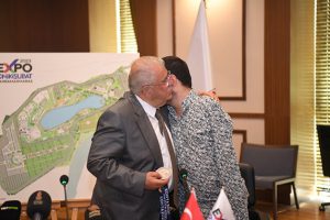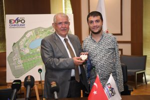 Başkan Mahçiçek, ziyaret sonrası Eroğlu’na EXPO 2023 mozaiği takdim etti.