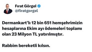 Büyükşehir Belediyesi, Dermankartlı 12 bin 651 aileye Ekim ayı ödemesi olarak 23 Milyon TL maddi destek sağladı.