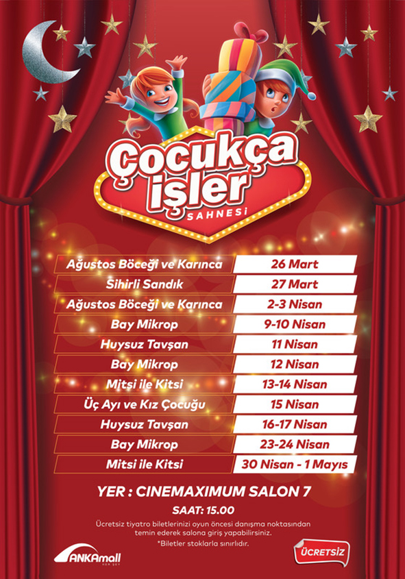 Çocuklar, ara tatilde sanata ve eğlenceye doyacak PROFAM tarafından yönetilen, Türkiye’nin önde gelen alışveriş merkezlerinden ANKAmall, minik ziyaretçileri için hayata geçirdiği Çocukça İşler Sahnesi’nde birbirinden keyifli oyunları çocukların beğenisine sunmaya devam ediyor. Çocukça İşler Sahnesi Ramazan ayı boyunca her hafta sonu farklı bir oyunla çocukları ağırlarken, ara tatil süresince haftanın her günü sergilenecek oyunlarla miniklere eğlenceli anlar yaşatacak. 9 – 10 Nisan tarihlerinde Bay Mikrop ile başlayacak oyunlar 1 Mayıs’a kadar devam edecek. Miniklere eğlenceli dakikalar yaşatacak oyunlar, ara tatil boyunca haftanın her günü saat 15.00’da ANKAmall Cinemaximum’da sergilenecek. Çocukça İşler Sahnesi Ramazan ayı boyunca her hafta sonu açık Birbirinden renkli oyunlarıyla çocuklara sanatın da kapılarını aralayan Çocukça İşler Sahnesi, Ramazan ayı boyunca her hafta sonu çocukları ağırlamaya devam edecek. 16 – 17 Nisan tarihlerinde Huysuz Tavşan, 23 – 24 Nisan’da Bay Mikrop, 30 Nisan – 1 Mayıs’ta ise Mitsi ile Kitsi miniklere yeni maceralar yaşatmaya devam edecek. Program 9 – 10 Nisan Bay Mikrop 11 Nisan Huysuz Tavşan 12 Nisan Bay Mikrop 13 – 14 Nisan Mitsi ile Kitsi 15 Nisan Üç Ayı ve Kız Çocuğu 16 – 17 Nisan Huysuz Tavşan 23 – 24 Nisan Bay Mikrop 30 Nisan – 1 Mayıs Mitsi ile Kitsi