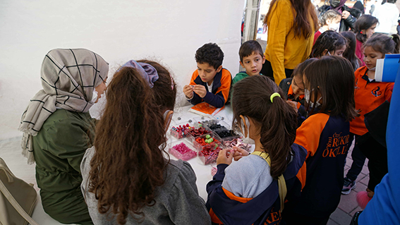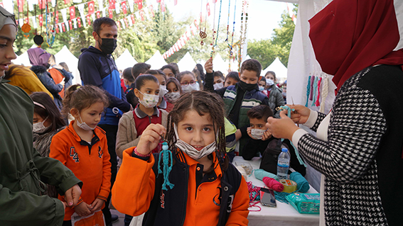 Uluslararası Kitap ve Kültür Fuarı kapsamında KAFUM’da çocuklar için açılan Büyükşehir Belediyesi Meslek Edindirme Kursları standı, el becerisi kazandıran mini atölyeleriyle fuarda ilgi topluyor. Kitap ayracı, takı, anahtarlık gibi materyaller üreten çocuklar, hediyelerden de son derece memnun.
