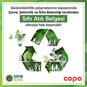 Konuyla ilgili açıklama yapan COPA Isı Sistemleri Genel Müdürü Oktay Erdinç: “Sürdürülebilirlik, global bir marka olma yolunda emin adımlarla ilerlerken stratejimizi oluşturan ana konulardan biri. Daha çevreci, daha yeşil bir dünya için sıfır atık, tüm süreçlerimizde belirlediğimiz önemli konuların başında geliyor. Sıfır atık yönetimi için gerekli olan tüm çalışmalarımızı özenle gerçekleştirdik, şirket içerisinde dönem dönem eğitimler düzenleyerek çalışma arkadaşlarımızı bilinçlendirdik. Tüm bunların sonucunda da ‘Sıfır Atık Belgesi’ni almaya hak kazandık. COPA olarak daha yeşil bir dünya için çalışmaya, üretmeye, doğaya ve insana dokunmaya devam edeceğiz.” dedi.