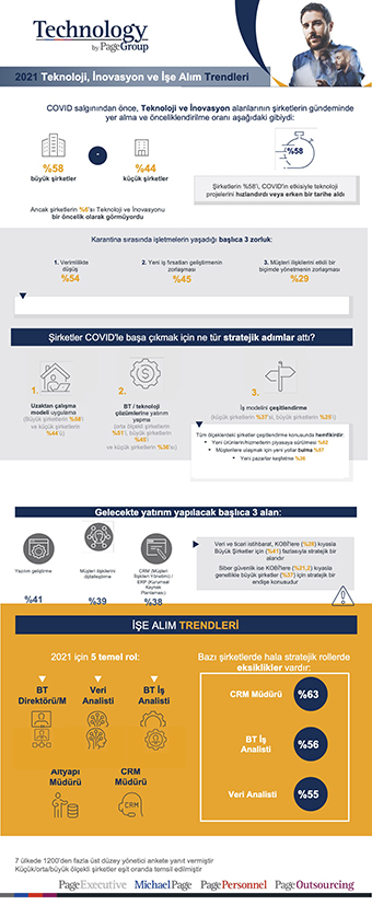 Dijital dönüşüm, geçtiğimiz yıldan bu yana yaşanan sağlık kriziyle birlikte, kuruluşların öncelikler listesinde daha üst sıralara yükseldi. Uluslararası işe alım ve danışmanlık şirketi PageGroup’un, “Şirketlerin BT ve Dijital Yetenek İhtiyaçları Araştırması”, şirketlerin %58'inin, Covid'in etkisiyle, teknoloji projelerine dahil olduğunu veya hızlandırdığını gösteriyor.  Başta Türkiye olmak üzere, İspanya, Portekiz, Polonya, Avusturya ve İsviçre'de 1.200'den fazla genel müdür, İK Yöneticisi ve CTO ile gerçekleştirilen araştırma, içinde bulunduğumuz süreçte pek çok firmanın, alternatif çalışma yöntemleri ve müşterileriyle farklı ilişki kurma yolları keşfettiklerini de ortaya koyuyor.