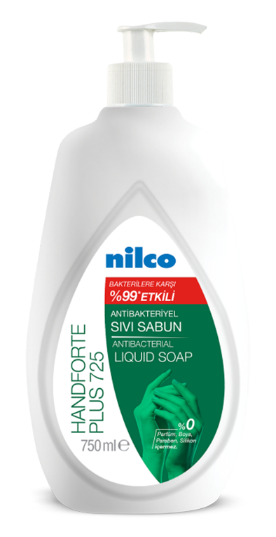 Nilco Handforte Plus 725 antibakteriyel sıvı el sabunu, etkili içeriğiyle ellerinizi bakterilerden %99 arındırıyor.