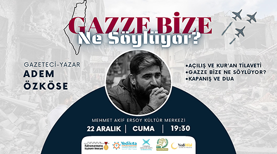 Büyükşehir Belediyesi öncülüğünde 22 Aralık Cuma günü Gazeteci – Yazar Adem Özköse’nin katılımıyla Mehmet Akif Ersoy Kültür Merkezi’nde ‘Gazze Bize Ne Söylüyor?’ konulu söyleşi düzenlenecek.