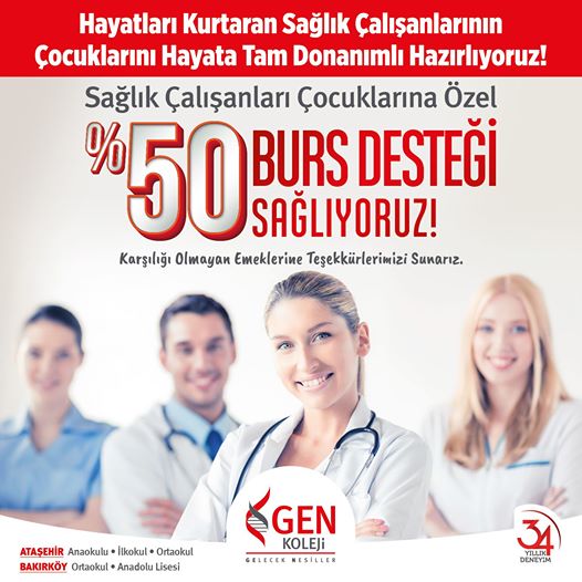 Tüm sağlık çalışanları, GEN Koleji’nin 2020-2021 eğitim-öğretim yılı “Gelecek Nesil Eğitim Modeli” yer almak için sunulan %50 burs desteğinden faydalanabilir. Bilgi almak için GEN Koleji’nin Ataşehir ve Bakırköy kampüslerinden veya https://bilgi.gen.k12.tr formundan iletişimde bulunabilirler.