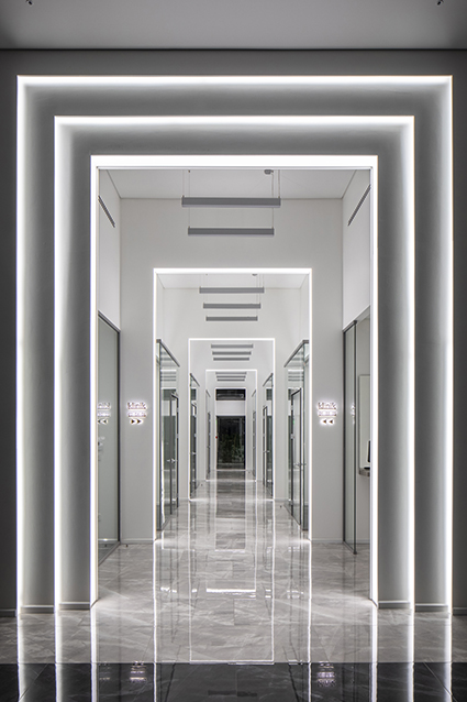 Her bir sekansta cam “box”lar olarak kendini okutan klinik odaları, mekanın geçirgen kamusallığını vurguluyor. Korkularak gelinen bir yer olarak hafızalara kazınan diş kliniği algısının mümkün mertebe davetkarlaştırılması tasarımın çıkış noktasında mimarların önemsediği parametrelerden. Koridor boyunca yer alan ışıklandırılmış taklar, ziyaretçilerin kamusal alandaki sirkülasyonları boyunca aydınlık ve tanımlı alanları deneyimlemesini sağlıyor. Klinik odalarının iç mekanlarında tasarlanan sanat nişleri ve yeşil odaklı alanlar ise hastaların psikolojilerinin rahatlamasında oldukça önemli bir etken.