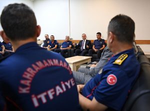 Kahramanmaraş Büyükşehir Belediye Bakanı Hayrettin Güngör, İtfaiye Haftası kapsamında İtfaiye Dairesi Başkanlığı’nı ziyaret ederek personellerle bir araya geldi. İtfaiye personelleriyle bir süre muhabbet eden Başkan Güngör, İtfaiye Haftası’nı kutlayarak özverili çalışmalarından dolayı teşekkür etti. Ziyarete ilişkin açıklamalarda bulunan Başkan Güngör, “Özverili ve fedakâr çalışmaları dolayısıyla her zaman gurur duyduğumuz İtfaiye personellerimizin İtfaiye Haftası’nı kutluyorum. Şehrimizde ve ülkemizin dört bir yanında meydana gelen yangın, doğal afet ve acil müdahale gerektiren durumlarda 7/24 görevlerinin başındalar. Rabbim yardımcıları olsun. Tüm İtfaiye personellerimize canı gönülden teşekkür ediyorum” dedi.