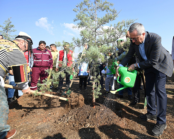 Konuşmasının devamında ormanların ve yeşil alanların varlığının öneminden bahseden Güngör, “Ormanlar ve yeşil alanlar şehirlerimizin, ülkemizin ve dünyamızın geleceği açısından çok önemli. Ülkemiz hatırı sayılır ölçüde orman varlığına sahip. Hamdolsun bu oran artarak devam ediyor. Şehir standardının en önemli kriterlerinden birisi de aktif ve ulaşılabilir yeşil alanların varlığıdır. Büyükşehir Belediyesi olarak bizler de Tarım ve Orman Bakanlığı, Orman Genel Müdürlüğü ve Orman Bölge Müdürlüğü iş birliğiyle şehrimizde ağaçlandırma ve yeşil alanlarının sayısının artırılması noktasında gayret ediyoruz. Fidanların toprakla buluşturulması ve muhafazası da son derece önemli. Orman ve yeşil alanların varlığı tüm canlılar için hayati önem taşıyor” ifadelerini kullandı. Protokol konuşmalarının ardından Büyükşehir Belediye Başkanı Hayrettin Güngör ve beraberindeki heyet, binlerce fidanı toprakla buluşturdu.