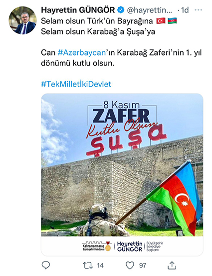 Kahramanmaraş Büyükşehir Belediyesi, Azerbaycan’ın Karabağ Zaferi’nin yıldönümünde şehri mavi, kırmızı ve yeşil renklere bürüdü. Kentteki tüm dijital panolardan paylaşılan mesajda, “Zafer bayramın kutlu olsun Can Azerbaycan” ifadeleri yer aldı. Geçtiğimiz yıl 44 gün süren vatan muharebesi gerçekleştiren ve 8 Kasım'da kültür başkenti Şuşa'yı kurtaran Azerbaycan’a bir tebrik de Kahramanmaraş Büyükşehir Belediye Başkanı Hayrettin Güngör’den geldi. Sosyal medyadan yaptığı paylaşımda Başkan Güngör, “Selam olsun Türk’ün Bayrağına, Selam olsun Karabağ’a, Şuşa’ya… Can Azerbaycan’ın Karabağ Zaferi’nin 1. yıldönümü kutlu olsun. Tek millet iki devlet” ifadelerini kullandı.