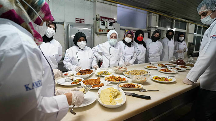 Büyükşehir Belediyesi Meslek Edindirme Kursları’nın (KAMEK) Aşçı Yardımcılığı Kursu yeni dönemde pratik eğitimlere başladı. Birbirinden lezzetli yemekleri pişiren kursiyerler, sertifikalarıyla dünya mutfaklarında çalışabiliyor. Kahramanmaraş Büyükşehir Belediyesi bünyesinde faaliyet gösteren Meslek Edindirme Kursları (KAMEK) yeni dönemde 16 branşta eğitimlerini sürdürüyor. Bu kapsamda KAMEK’teki atölyelerden Aşçı Yardımcılığı kursiyerleri mutfak eğitimleri için kolları sıvadı. Uzman eğitmenlerin gözetiminde teorik eğitimlerini tamamlayan 28 kursiyer, Büyükşehir Belediyesi’nin profesyonel mutfaklarında pratikte de birçok yeterlilik kazanıyor. Toplamda 5 ay sürecek eğitimleri başarıyla tamamlayan katılımcılara ise Milli Eğitim Bakanlığı onaylı sertifikaları verilecek. Şimdiye kadar toplamda 461 kişinin mezun olduğu Aşçı Yardımcılığı kursundan sertifika alan kursiyerler, eğitimlerdeki kazanımlarıyla çeşitli otellerde ve dünya mutfaklarında istihdam edilebiliyor.