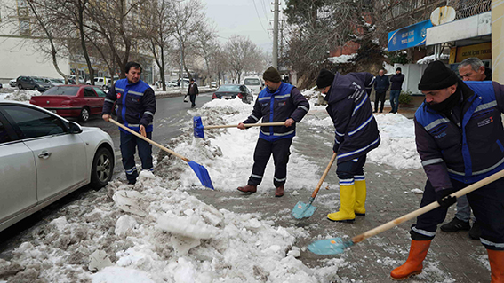 Şehir genelinde bir yandan tuzlama ve yol açma çalışmaları gerçekleştiren Büyükşehir Belediyesi ekipleri, öte yandan yoğun yağışlar nedeniyle yola savrulan nesnelerin kaldırılması ve yaya yollarının açılması için seferber oldu. Kahramanmaraş Büyükşehir Belediyesi 210 araç ve 400’ün üzerinde personelle kış şartlarıyla mücadele çalışmalarını sürdürüyor. Yoğun kar yağışının ardından şiddetli fırtına ve rüzgarın yaşandığı kentte, bir yandan yol açma ve buzlanma önleyici uygulamalar gerçekleştirilirken, öte yandan yaya geçitleri, otobüs durakları, yürüyüş yolları, üst geçitler de temizlendi. Çalışmalarda, şiddetli rüzgar nedeniyle kırılarak yollara savrulan muhtelif türden nesneler kaldırıldı, güvenlik önemleri alındı. Ekipler, zemindeki buzların yürüyüş yollarında olumsuzluklara neden olmaması için kazıma ve tuz uygulamalarını da gerçekleştiriyor.