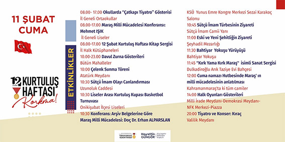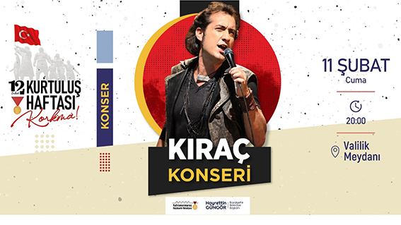 Kurtuluş Haftası etkinlikleri kapsamında 11 Şubat Cuma günü 20.00’da sevilen sanatçı Kıraç, Kahramanmaraşlılarla buluşacak. Valilik Meydanı’nda gerçekleştirilecek konser öncesi oyuncular arasında Tamer Karadağlı’nın da yer aldığı ‘Kurtuluş Destanı’ tiyatro gösterimi de yapılacak. Kahramanmaraş Büyükşehir Belediyesi tarafından düzenlenen 12 Şubat Kurtuluş Haftası etkinlikleri tüm hızıyla devam ediyor. Söyleşiden konferansa, tiyatro gösterimlerinden sergilere kadar birçok alanda gerçekleştirilen etkinlikler kapsamında 11 Şubat Cuma günü Kıraç konseri düzenleniyor. Saat 20.00’da Valilik Meydanı’nda gerçekleştirilecek program kapsamında sevilen sanatçı Kıraç, Kahramanmaraşlılarla buluşacak. Etkinlik öncesi ana sahnede oyuncuları arasında Tamer Karadağlı’nın da yer aldığı ‘Kurtuluş Destanı’ tiyatrosunun gösterimi yapılacak. Tüm Vatandaşlar Davet Edildi Gerçekleştirilecek etkinlik ile ilgili Kültür Spor ve Turizm Dairesi Başkanlığı tarafından yapılan açıklamada, “Kurtuluş Haftası etkinliklerimiz tüm hızıyla devam ediyor. Program kapsamında 11 Şubat Cuma günü 20.00’da Kıraç konseri düzenliyoruz. Valilik Meydanı’nda gerçekleştirilecek konser öncesi oyuncuları arasında Tamer Karadağlı’nın da yer aldığı ‘Kurtuluş Destanı’ tiyatrosunun gösterimi yapılacak. Programımıza tüm hemşehrilerimiz davetlidir” ifadeleri kullanıldı.