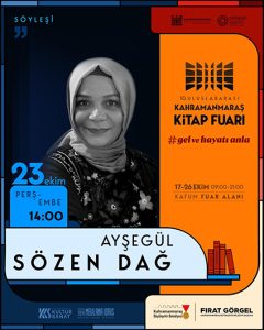 23 Ekim Perşembe günü saat 14.00’da çocuk edebiyatına ilişkin kaleme aldığı eserlerle dikkat çeken yazar Ayşegül Sözen Dağ, söyleşi etkinliğinde edebiyatseverlerle bir araya gelecek. Günün bir diğer söyleşi programında saat 16.00’da yine çocuk edebiyatının sevilen isimlerinden Salih Zengin sahne alacak. Zengin, kitapların hayal gücü üzerindeki etkilerini konuşacak. Günün son programında ise tarih sohbetleri yapılacak. Saat 19.00’da Prof. Dr. Tufan Gündüz, katılımcılara tarihi aydınlatan bilgiler paylaşacak. Büyükşehir Belediyesinden yapılan açıklamada, 10. Uluslararası Kahramanmaraş Kitap Fuarı’nın yedinci gününde gerçekleştirilecek programlara tüm vatandaşların davetli olduğu belirtildi.
