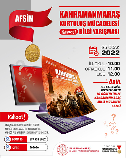 Büyükşehir Belediyesi’nin katkılarıyla hayata geçen “Korkma! İstiklal İlham Verir” projesi kapsamında 24 – 31 Ocak tarihleri arasında çevrimiçi ödüllü bilgi yarışması düzenlenecek. Kahramanmaraş Büyükşehir Belediyesi ve İl Milli Eğitim Müdürlüğü işbirliğiyle düzenlenen “Korkma! İstiklal İlham Verir” projesi eğlence ve bilgi dolu bir etkinliğe ev sahipliği yapacak. Milli Mücadele ve Maraş harbinin farklı yaş gruplarına anlatılması ve 12 Şubat tarihinin ölümsüzleştirilmesi maksadıyla düzenlenen projede, çevrimiçi ve ödüllü bilgi yarışmaları gerçekleştirilecek. 24 – 31 Ocak tarihleri arasındaki yarışmalar İlkokul, Ortaokul ve Lise öğrencilerine yönelik olarak düzenlenecek. Yarışmalar Kahoot! Uygulamasında Çevrimiçi düzenlenecek yarışmalar, her ilçe için ayrı ayrı yapılacak. Zoom üzerinden kullanıcı adı ve şifrelerle katılım sağlanabilen yarışmalarda, her kategoride dereceye giren öğrencilerle Kahramanmaraş Milli Mücadele Gezisi düzenlenecek. Çevrimiçi düzenlenecek yarışmalara ilişkin kullanıcı adı ve şifrelere Büyükşehir Belediyesi ve İl Milli Eğitim Müdürlüğü sosyal medya hesaplarından erişilebilirken, detaylı bilgi ise http://kmarasarge.meb.gov.tr/www/korkma-istiklal-ilham-verir-projemiz-basladi/icerik/497 adresinde yer alıyor.