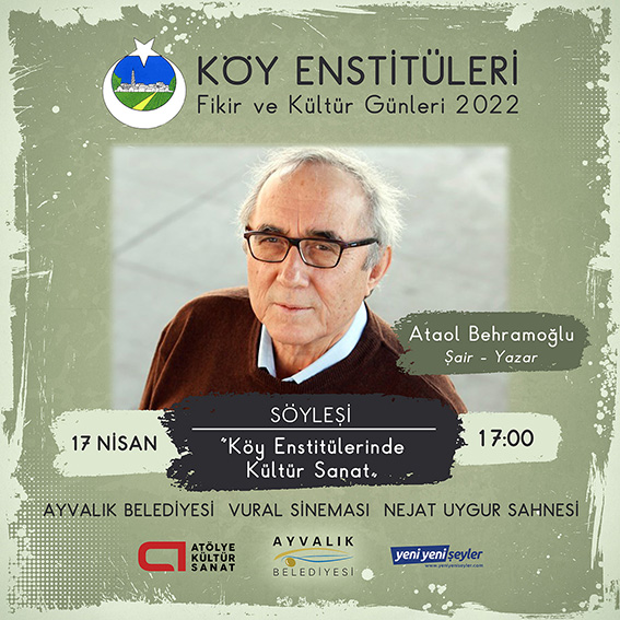 17 Nisan günü usta şair ve yazar Ataol Behramoğlu’nun ‘’Köy Enstitülerinde Kültür ve Sanat’’ adlı söyleşisi ve şiir dinletisi ile başlayan organizasyon, halk müziğinin önemli ismi Mazlum Çimen konseri ile son bulacak. İki gün boyunca yapılacak tüm etkinlikler Ayvalık Belediyesi Vural Sineması Nejat Uygur Sahnesi'nde gerçekleştirilecek.