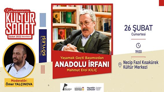 Şubat Kültür Sanat Etkinlikleri kapsamında 26 Şubat Cumartesi günü (yarın) düzenlenecek diğer bir etkinlikte ise Tasavvuf Profesörü Mahmut Erol Kılıç Kahramanmaraşlılarla bir araya gelecek. Ömer Yalçınova’nın moderatörlüğünü yapacağı söyleşi saat 19.00’da başlayacak. Necip Fazıl Kısakürek Kültür Merkezi’nde gerçekleştirilecek etkinlikte ‘Anadolu İrfanı’ başlığı altında Türkiye’nin manevi muhteviyatı farklı açılardan ele alınacak. Kültür Spor ve Turizm Dairesi Başkanlığı’ndan yapılan açıklamada, ücretsiz olarak düzenlenen etkinliklere tüm vatandaşlar davet edildi.