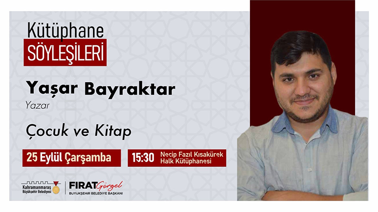 Büyükşehir Belediyesinin Kütüphane Söyleşileri’nde bu hafta Yazar Yaşar Bayraktar edebiyatseverlerle buluşacak. 25 Eylül Çarşamba günü düzenlenecek programda “Çocuk ve Kitap” konusu ele alınacak.