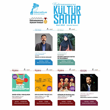 Kahramanmaraş Büyükşehir Belediyesi Mart Kültür Sanat Etkinlikleri takvimi belli oldu. Birbirinden değerli isimlerin katılımıyla konserden tiyatro gösterilerine, söyleşiden konferansa kadar pek çok etkinlik kültür sanat dostlarıyla buluşacak.