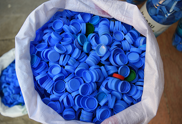 Dulkadiroğlu Belediyesi tarafından görevlendirilen engelli personel Oktay Uzunca, büyük bir gayretle vatandaşların topladığı mavi kapakları yerinde teslim alıyor.