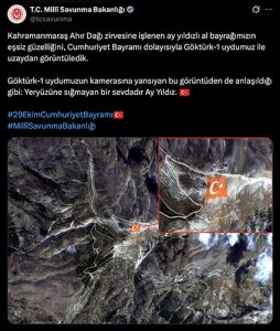 Milli Savunma Bakanlığı’nın resmi sosyal medya hesaplarından yapılan paylaşımda, “Kahramanmaraş Ahır Dağı zirvesine işlenen ay yıldızlı al bayrağımızın eşsiz güzelliğini, Cumhuriyet Bayramı dolayısıyla Göktürk-1 uydumuz ile uzaydan görüntüledik” ifadelerine yer verildi.