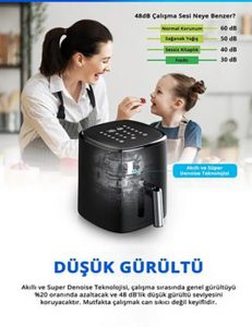 Minik ve akıllı tasarımı ile 5 Litre kapasitesi sayesinde (3-4 kişilik) patates kızartması ve tavuk kanadı gibi taleplerinizi hızlıca karşılar.