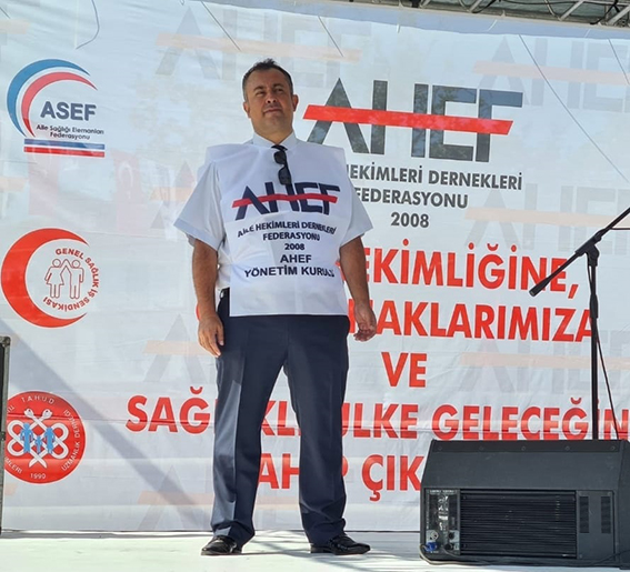 Aile Hekimleri Dernekleri Federasyonu (AHEF) 2. Başkanı Dr. Hacı Yusuf Eryazğan, “Ödeme Sözleşme Yönetmeliği’ne karşın kararlı duruşumuz devam ediyor.1 Temmuz’da yayınlanan yeni yönetmelikle ilgili henüz bakanlıktan olumlu bir adım göremedik” dedi. Ödeme Sözleşme Yönetmeliği’ndeki onlarca ceza içeren maddenin geri çekilmesi ve hak kayıpları için bir mücadele başlattıklarını söyleyen Dr. Eryazğan, istifa dilekçeleri ellerinde Bakanlığın harekete geçmesini beklediklerine dikkat çekti: “16 ve 27 Ağustos’ta iş bırakarak kararlığımızı ortaya koyduk.11 Eylül’de bir miting ile bize destek olan tüm STK’larla var gücümüzle haykırdık. ‘Haksızlık varsa biz yokuz’ dedik. Artık kamuoyu biliyor ki aile hekimleri, bu yönetmelik geri çekilene kadar mücadele edecek. 11 Eylül sonrası 75 il derneğimizle istişare toplantısı yaparak gelecekte yapacaklarımızı tartıştık. AHEF olarak 3.5 yıllık süreçte moderatörlüğünü yürüttüğümüz 1. Basamak Sağlık ve Emek Platformunda bulunan AHESEN, ASEF, BDS, GENEL SAĞLIK İŞ, SES, TAHUD, TTB aile hekimliği kolu ile birlikte 2 miting, 5 iş bırakma, 3 deklarasyon yayını yaparak aile hekimliği çalışanlarının sesi olduk. Ortak olarak yürüttüğümüz bu platform çalışmalarında, yönetmelikle ilgili miting sonrası değerlendirmelerimize devam ediyoruz. Ve kararımız kesinlikle yönetmelik geri çekilene kadar mücadelemizi devam etmek yönündedir.”