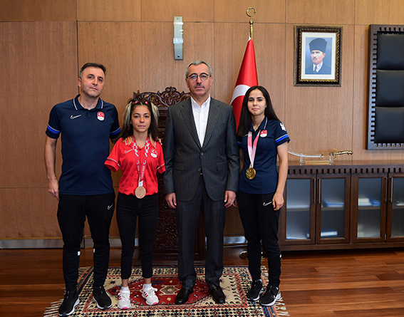 Kahramanmaraş Büyükşehir Belediye Başkanı Hayrettin Güngör, milli sporcularla bir araya geldi. Bir süre önce Tokyo’da düzenlenen 2020 Olimpiyatları Paralimpik Oyunları’nda ay yıldızlı üniformayla mücadele eden Sevilay Öztürk ve Fatma Gül Güler’in gerçekleştirdiği ziyarete, Milli Takım Goalball antrenörü Gültekin Karasu da katıldı. Büyükşehir Gençlik ve Spor Kulübü yüzücüsü Sevilay Öztürk, Tokyo’da düzenlenen Kadınlar 50 metre sırtüstü S5 yarışmalarında üçüncü olarak ülkenin bu branştaki ilk bronz madalyasını kazanırken, Goalball Kadın Milli Takımı sporcusu Kahramanmaraşlı Fatma Gül Güler ise altın madalya kazanarak ay yıldızlı bayrağı göndere çektirmişti.