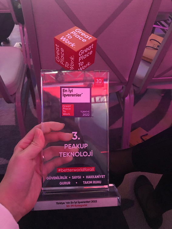 Great Place to Work Sertifikası şirket içerisinde güven kültürünü sağlamlaştırmış ve çalışanları tarafından başarılı bulunan şirketlere veriliyor. Güven, hakkaniyet, saygı, gurur ve takım ruhu gibi kriterlerin ölçüldüğü ankette PEAKUP, sahip olduğu Great Place To Work for Women, Great Place to Work for IT, Happy Place To Work (En Mutlu İşyeri) ödüllerinin yanı sıra bu yıl da en iyi işverenler arasında ilk 3’e girdi.
