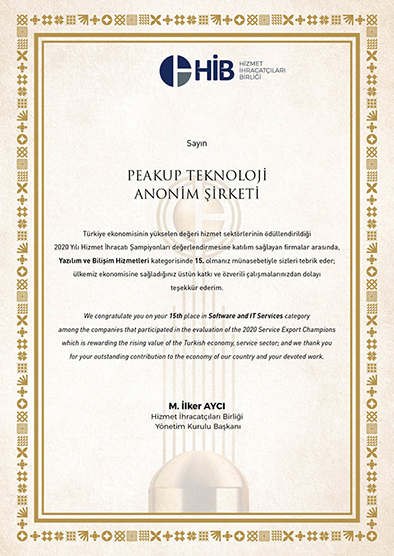 Hizmet İhracatçıları Birliği (HİB), sektörün 2020 yılı ihracat şampiyonlarını açıkladı. Teknoloji şirketi PEAKUP da ‘Yazılım ve Bilişim Hizmetleri’ kategorisinin şampiyonları arasında yer aldı.
