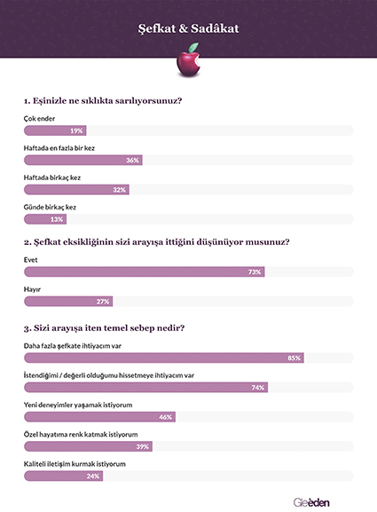 İlişkisi sürerken arayışa geçen kadınlara, denizlere yelken açmaya iten neden sorulduğunda, %85'inden fazlası bunun ilişkilerindeki temas ve şefkat eksikliği olduğunu söylerken, %74’ü istendiğini ve değerli olduğunu hissetmeye ihtiyacı olduğunu belirtiyor. %55’i yeni deneyimler yaşamak, %42’si özel hayatına renk katmak istediğini dile getirirken, %24’ü ise daha kaliteli iletişim kurma ihtiyacını öne çıkarıyor. Gleeden İletişim Direktörü Solène Paillet bu anketi yorumlarken : "İlişkilerdeki şefkat eksikliğinin, kadınlarda kırgınlık hissi uyandırması kimseye şaşırtıcı gelmez. Ancak bir kadının bu nedenle ayrılabileceğini düşünmek, sarsıcı olacaktır.  Çiftlerin ilişkilerindeki uyum seviyesini genelde cinsel beraberliğin sıklığı ile ölçümlemek genel kabuldür. O frekansı yaratanın gün içerisinde gösterilen sevgi belirtileri olduğu gerçeğini atlamamak gerekiyor.Sitemize üye olan kadınların bu araştırmayla verdiği mesaj açıktır. Şefkat, kadınlar için sadece cinsel performanslarını belirleyen bir parametre değil, eksikliğinin hissedilmesi, onları yeni arayışlara yönlendiren bir itici güç de aynı zamanda. Günlük yaşamın içinde fiziksel olarak yalnız bırakıldığını hisseden bir kadın sonunda içinde bir tık sesi duyuyor ve yenilikler aramaya başlıyor.Gün içerisinde düzenli olarak sevgi belirtileri gösteren çiftlerin, hayâl kırıklığı yaratan durumlarda iletişim kurmaları kolaylaşıyor. Bu da ilişkilerinin toplam süresini belirliyor.” şeklinde görüş bildiriyor.