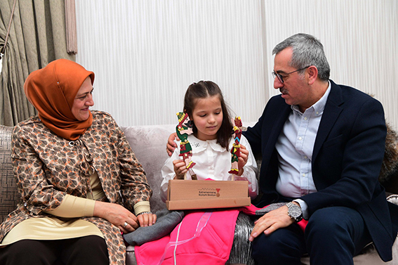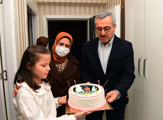 Kahramanmaraşlı Şehit Nurettin Ademoğlu’nun kızı Zeynep’in 10. Yaş gününü kutlayan Başkan Güngör, “3 tatlı kız çocuğunu bizlere emanet edip vatan müdafaasında hakka yürüyen kahramanımız her daim milletin duasında, emanetleri de başımızın üzerindedir” dedi. Kahramanmaraş Büyükşehir Belediye Başkanı Hayrettin Güngör, eşi Leyla Güngör ile Şehit Polis Memuru Nurettin Ademoğlu’nun kızı Zeynep’in doğum gününü kutladı. Türkiye Harp Malulü Gaziler, Şehit, Dul ve Yetimleri Derneği Kahramanmaraş Şubesi Başkanı Yunus Karaman ve İş İnsanı Sami Kervancıoğlu’nun da yer aldığı ziyarette Zeynep için pasta kesildi. Şehit Nurettin Ademoğlu’nun eşi Feride Ademoğlu ziyaretten duyduğu memnuniyeti ifade ederek Büyükşehir Belediye Başkanı Hayrettin Güngör’e teşekkür etti. Zeynep’in 10. Yaşı Kutlandı Şehit Nurettin Ademoğlu’nun çocukları Seda Nur, Senanur ve Zeynep ile yakından ilgilenen Büyükşehir Belediye Başkanı Hayrettin Güngör, “Şehit Polis Memuru Nurettin Ademoğlu kardeşimizin emanetlerinden Zeynep kızımızın 10. yaş gününü kutladık. 3 tatlı kız çocuğunu bizlere emanet edip vatan müdafaasında hakka yürüyen kahramanımız her daim milletin duasında, emanetleri de başımızın üzerindedir” ifadelerini kullandı. Başkan Hayrettin Güngör, 10. Yaşını kutlayan Zeynep Ademoğlu’na el işi ahşap oyuncak hediye etti.