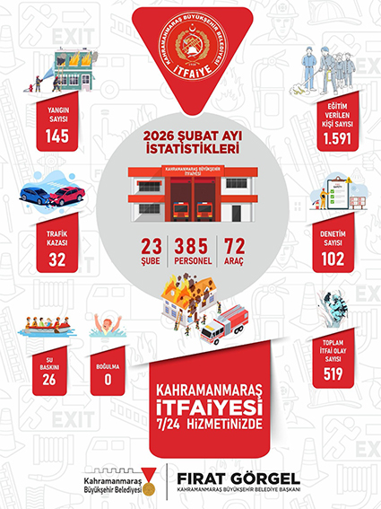 Kahramanmaraş Büyükşehir Belediyesi İtfaiye Dairesi Başkanlığı, şubat ayında şehir genelinde etkili bir çalışma yürüttü. 23 şube, 385 personel ve 72 araç ile müdahalede bulunan ekipler, 145 yangın, 32 trafik kazası, 26 su baskını ve 519 diğer itfai olaya hızlı ve koordineli şekilde müdahale etti.
