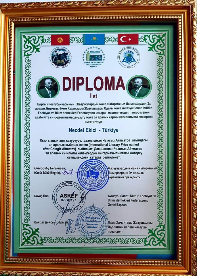 Kazakistan’dan Dünya Halkları Yazarlar Birliği, Kırgızistan Cumhuriyeti Yazarlar ve Sanatkârlar Uluslararası Birliği ve Türkiye – Avrasya Kültür Sanat Edebiyat Bilim Dernekleri Federasyonu’nun ortaklaşa düzenledikleri yarışmada Cengiz Aytmatov ödülü Afşinli YARPUZ Edebiyat Dergisi Yazarı Necdet Ekici’ye verildi.