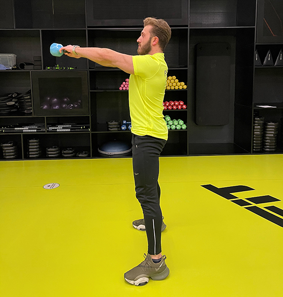 Kettlebell’i iki elinle sıkıca kavra, ayaklarını omuz genişliğinden biraz daha geniş olacak şekilde aç. Başını yukarıda ve göğsünü de dik tutarak kalçandan öne doğru eğil. Kollarını düz tutarak, kettlebell’i omuz hizana getir. Bu esnada kettlebell’i kalça kuvvetinle ittiğinden emin ol, kettlebell omuz hizana geldiğinde kalçanı sık. 10-12 tekrar yap.