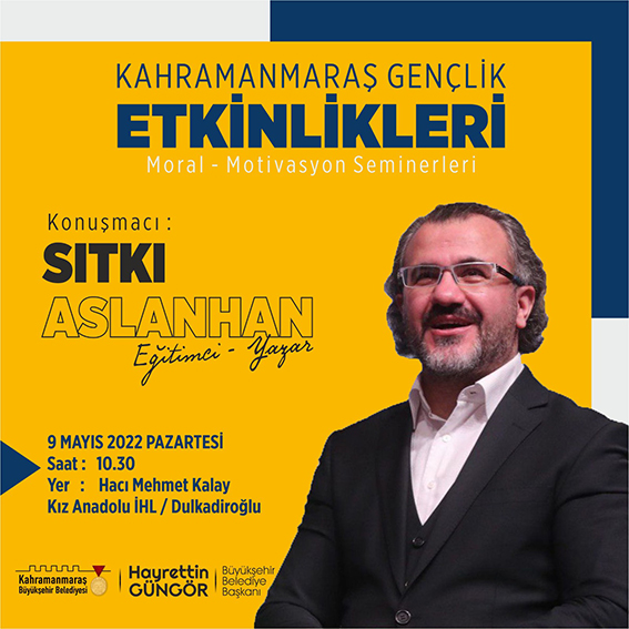 Büyükşehir Belediyesi tarafından düzenlenen moral ve motivasyon seminerlerinin son gününde Eğitimci - Yazar Sıtkı Aslanhan, saat 10.00’da Mehmet Akif Ersoy Kültür Merkezi’nde öğrencilerle bir araya gelerek sınav sürecinde moral ve motivasyonu yükseltme, daha verimli ders çalışma ve sınav sürecini iyi yönetme gibi konularda öğrencilere faydalı bilgiler aktaracak. Yazar Aslanhan, saat 13.30’da ise Göksun Arslanbey Millet Konağı’nda moral ve motivasyon seminerinde Göksunlularla bir araya gelecek.