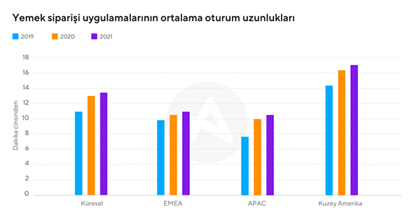 Kurulum rakamlarındaki artış çarpıcı olsa da, oturumlar daha da fazla dikkat çekiyor. Yemek siparişi uygulamalarının küresel oturumları 2020'de 2019'a kıyasla %88 arttı ve 2021'de şimdiye kadar %43 daha yükseldi.
