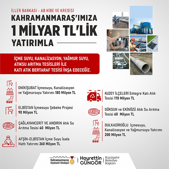 Kahramanmaraş Büyükşehir Belediye Başkanı Hayrettin Güngör tarafından duyurulan 1 Milyar TL’lik yeni yatırım bütçesiyle kentin alt ve üstyapısı baştan aşağı yenilenecek. İller Bankası ve Yerel Yönetimler Alt Finansman Anlaşması İmza Töreni'nin ardından açıklanan bütçe; Cumhurbaşkanlığı, Çevre ve Şehircilik Bakanlığı, Avrupa Birliği ve Dünya Bankası ile İLBANK katkılarıyla sağlanacak. Yapılan finansal anlaşmalar kapsamında 1 Milyar TL’lik yatırım bütçesi, Kahramanmaraş’ta içmesuyu, kanalizasyon, yağmursuyu, atıksu arıtma tesisleri ile katı atık bertaraf tesisi projelerini finanse edecek.